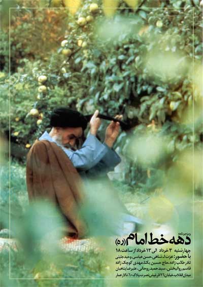 ویژه برنامه دهه خط امام سوم خرداد تا سیزدهم خرداد هر روز ساعت 18 خیابان انقلاب . خیابان 16 آذر . نبش نصرت پلاک 60 . تالار عمار علیرضا پناهیان . وحید جلیلی . نادر طالب زاده . حسن عباسی حمید روحانی . حسین یکتا . قاسم روانبخش . کوچک زاده عزت الله شاهی
